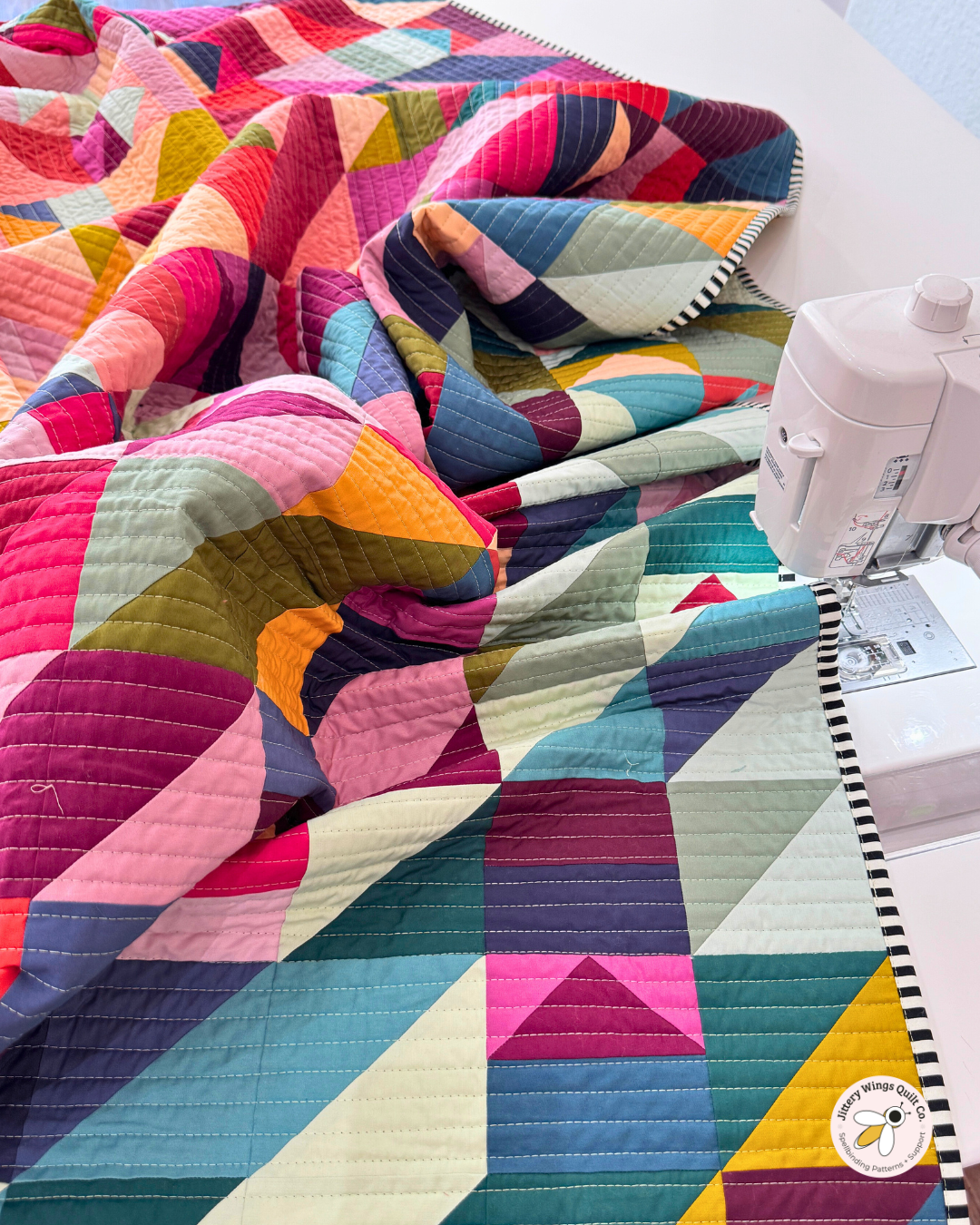 The striped binding adds just enough graphic contrast to frame the quilt without pulling attention away from the color work. It’s a finish I come back to often for bold quilts like this.